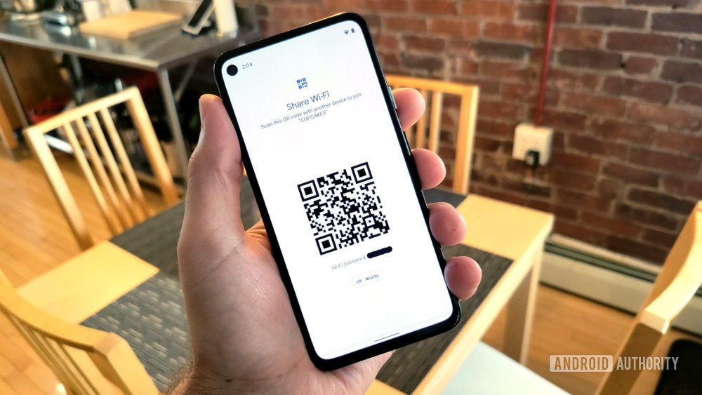 Dalam stok Android 11, jika Anda ingin membagikan koneksi Wi-Fi Anda saat ini dengan seseorang, Anda dapat membuat kode QR dengan mudah. Namun, di Android 12, Anda dapat menghindari pemindaian kode batang dan cukup tekan tombol “Terdekat” yang Anda lihat di bawah kode QR pada gambar di atas. Itu akan menggunakan fitur Berbagi Terdekat Android untuk mengirimkan kredensial Wi-Fi kepada siapa pun yang Anda suka.